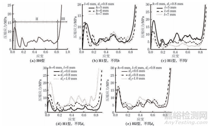 由圖4可知:3種BCC點陣試樣的壓縮過程均可分為3個典型階段,即線彈性階段(區(qū)域I)、 平臺階段(區(qū)域Ⅱ)和致密化階段(區(qū)域Ⅲ),應力達到屈服點后明顯下降,屬拉伸主導型多孔材料。由表2可知:與H0型和H1型BCC點陣試樣相比(在相同的單胞高度、單胞寬度、斜桿/外圍豎直桿桿徑 下),H2型BCC點陣試樣的比強度、平臺應力和單位質量吸能最大,H1型次之,H0型最小,說明H2型BCC點陣試樣的壓縮性能和吸能特性最強。