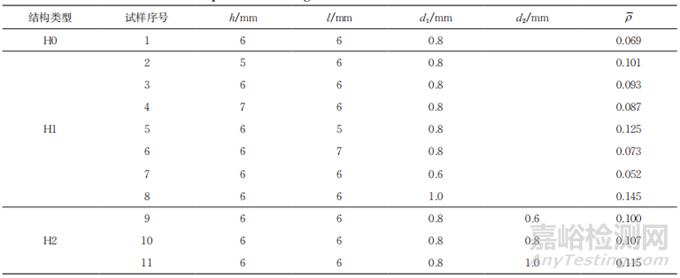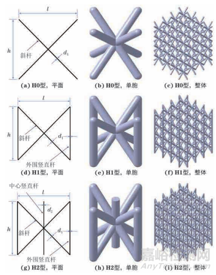采用Catia軟件進行建模設計,分別在傳統(tǒng)BCC點陣結構(H0型)的單胞外圍以及外圍和中心添加豎直桿,設計出H1型和H2型2種衍生BCC點陣結構。3種BCC點陣結構的平面結構、單胞結構及整體結構如圖1所示;整體結構由單胞在x,y和z方向進行線性陣列得到。單胞的主要參數包括單胞高度h、單胞寬度l、單胞相對密度ρ 、斜桿/外圍豎直桿桿徑d1、中心豎直桿桿徑d2,具體數值見表1。其中,ρ采用公式計算得到,公式如下: