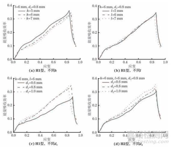 由圖5可見:H1、H2型BCC點陣試樣在彈性階段的能量吸收效率隨應變增加快速增大,到達屈服點后增大速度變慢,這是由于平臺階段應力降低導致的;達到致密應變附近,能量吸收效率開始快速減小,這是因為致密化階段峰值應力迅速升高而試樣吸能較少。隨著單胞高度增加,H1型BCC點陣試樣的能量吸收效率減小,但減小幅度不大;隨著斜桿和外圍豎直桿桿徑增加,能量吸收效率顯著增大,但當桿徑增加至0.8mm及以上時,能量吸收效率變化不再明顯,說明斜桿和外圍豎直桿桿徑增加對能量吸收效率的提升存在臨界效應;單胞寬度對能量吸收效率基本沒有影響。隨著中心豎直桿桿徑增加,H2型BCC點陣試樣的能量吸收效率呈現(xiàn)一定幅度的提升。