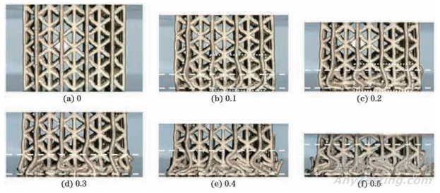 圖6 不同應變下H1型BCC點陣試樣的形貌(h=5 mm,l=6 mm,d1=0. 8 mm)