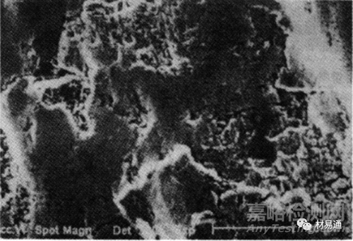 接觸疲勞的宏觀特征是接觸表面出現(xiàn)許多針狀或痘狀的凹坑,稱為麻點(diǎn),也叫點(diǎn)蝕或麻點(diǎn)磨損。有的凹坑很深,呈“貝殼”狀,有疲勞裂紋發(fā)展線的痕跡存在,圖12是GCr15鋼接觸疲勞失效的表面形貌。