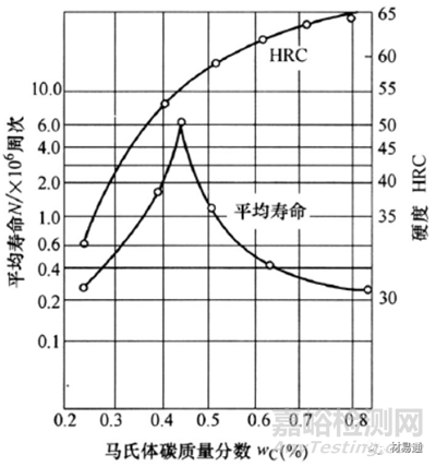 圖13 馬氏體中碳質(zhì)量分?jǐn)?shù)與接觸疲勞壽命的關(guān)系