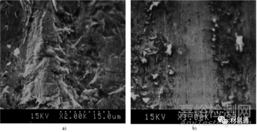 圖6 磨粒磨損表面的犁溝和磨屑(SEI) a)犁溝;b)磨屑