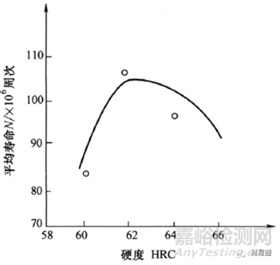 對于軸承研究表明,在一定硬度范圍內(nèi),接觸疲勞壽命隨表層硬度的提高而延長,當(dāng)表面硬度超過一定值后,再提高硬度,接觸疲勞壽命反而會降低。如圖14所示,硬度在62HRC左右壽命最高,低于或高于這個硬度范圍,其壽命均有較大的降低。