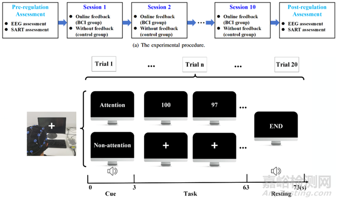 圖1(a)實(shí)驗(yàn)為2次基線評(píng)估和10次注意調(diào)節(jié)(b)EEG評(píng)估過程中受試者的示例圖像。