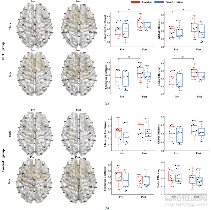 網(wǎng)絡(luò)屬性:為了比較不同注意水平和前/后調(diào)節(jié)會(huì)話下腦網(wǎng)絡(luò)的效率,計(jì)算了權(quán)重網(wǎng)絡(luò)屬性,計(jì)算了聚類系數(shù)(Clu)和全局效率(Ge),是評(píng)估腦網(wǎng)絡(luò)中功能分離和整合的兩個(gè)基本指標(biāo)。該研究使用Brain Connectivity Toolbox計(jì)算這些網(wǎng)絡(luò)屬性。圖3展示了基于PLV方法的大腦網(wǎng)絡(luò)拓?fù)浣Y(jié)構(gòu)和屬性。對(duì)于BCI組,存在顯著差異的腦網(wǎng)絡(luò)連接數(shù)量顯著增加,且在Post EEG評(píng)估中比Pre EEG評(píng)估中更集中于額區(qū)和頂區(qū)。如圖3(a)所示,網(wǎng)絡(luò)屬性結(jié)果顯示,在注意調(diào)節(jié)實(shí)驗(yàn)后,注意狀態(tài)下的Clu和Ge顯著增加。