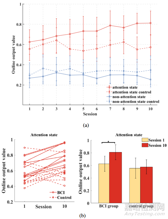 統(tǒng)計(jì)學(xué)分析:首先計(jì)算了每個(gè)調(diào)節(jié)會(huì)話中每個(gè)受試者在注意和非注意狀態(tài)下的平均輸出注意力水平。為了確定不同調(diào)節(jié)階段之間注意力水平的顯著性差異,采用了重復(fù)測(cè)量單因素方差分析(ANOVA)。采用配對(duì)t檢驗(yàn)比較注意和非注意狀態(tài)下的會(huì)內(nèi)注意水平,并采用錯(cuò)誤發(fā)現(xiàn)率(FDR )校正方法進(jìn)行多重比較。圖4(a)顯示從第1階段到第10階段的在線調(diào)節(jié)實(shí)驗(yàn)的平均輸出值。對(duì)于BCI組,隨著調(diào)節(jié)次數(shù)的增加,注意狀態(tài)的在線輸出值呈現(xiàn)增加的趨勢(shì),而非注意狀態(tài)的輸出值沒有表現(xiàn)出明顯的增加或減少的趨勢(shì)。