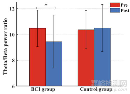 圖5為10次調(diào)節(jié)前后基線EEG評(píng)估中注意狀態(tài)時(shí)額區(qū)theta/beta功率比。額葉包括FP1,F(xiàn)P2,F(xiàn)3,F(xiàn)4,F(xiàn)Z,F(xiàn)7和F8通道,theta/beta功率比在所有試驗(yàn)和每組所有10名受試者中平均。對(duì)于BCI組,在10次注意調(diào)節(jié)會(huì)話(t檢驗(yàn), FDR校正, p<0.05)后,theta/beta功率比在注意狀態(tài)下顯著下降。對(duì)于控制組,腦電評(píng)估前后的功率比沒有顯著差異。
