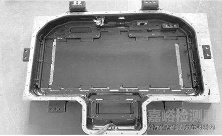 為驗證上述箱體改善方案是否有效,最終版箱體設計是否滿足標準要求,本動力電池系統(tǒng)進行振動試驗,在經過12 h 的隨機振動和頻率為24 Hz 正弦定頻振動1 h 試驗后,通過檢測振動后動力電池系統(tǒng)的氣密性,氣密性檢測方法:往箱體內充氣,直至箱內壓強達3.0 kPa,保壓30 s 后,開始測試,60 s 后箱體的泄氣值≤100 Pa 時,判定箱體外殼體無任何開裂。本動力電池系統(tǒng)振動試驗后泄氣值測試結果為41 Pa,故可判定箱體外殼體局部應力最大值處無開裂。對振動試驗后的動力電池系統(tǒng)進行拆箱,經目視檢測,可判定后箱體內部梁局部應力大值處無開裂,如圖9 所示。