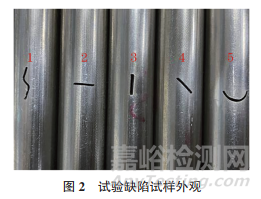 檢測試驗裝置主要包括探頭、信號發(fā)生器、采集卡和計算機等(見圖1)。試驗材料為304不銹鋼鋼管。通過電火花在鋼管試樣上制造人工缺陷,試驗共設(shè)置5種不同的缺陷類型(見圖2)。采用渦流點探頭可以確保探頭在焊管中進行精確定位與測量,探頭參數(shù)如表1所示,激勵參數(shù)如表2所示。探頭沿缺陷試樣軸向掃描,存儲離散數(shù)據(jù),實現(xiàn)渦流信號采集。