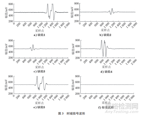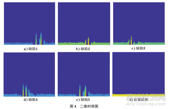 缺陷的類型不同,其對應的時頻圖也不同。圖4中顏色的深淺對應了頻率的不同幅值,其中藍色是二維時頻圖的背景色。對每個缺陷譜圖的顏色深度進行識別,可以清楚地區(qū)分缺陷類型。由圖4可知:缺陷1色譜圖中兩種顏色區(qū)域有明顯的斷層峰值,表示該處為缺陷位,且峰值之間的距離表示缺陷的大??;缺陷2 色譜圖的正常區(qū)域為綠色區(qū)域,黃色峰區(qū)為缺陷;缺陷3的色譜圖中黃色峰值區(qū)間為缺陷,且缺陷的大小與缺陷2接近;缺陷4色譜圖中天藍色表示這個區(qū)域的材料是合格、沒有缺陷的,而中間的黃色峰區(qū)表示該處存在缺陷;缺陷5色譜圖中峰值處與天藍色區(qū)域有明顯的斷層,表示缺陷不連貫;標準試樣色譜圖中黃色區(qū)域貫穿了整個時間軸,即沒有缺陷。通過二維時頻圖可以對焊管缺陷的類型進行區(qū)分。