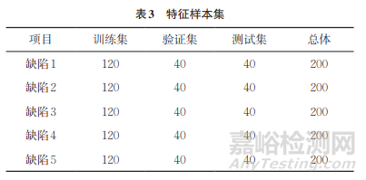 將圖4的二維時頻圖作為訓練特征輸入CNN輸入層中,制作特征樣本集,如表3 所示,并將各種缺陷的時頻圖按3∶1∶1的比例隨機分為訓練集、驗證集和測試集。