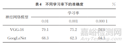 學習率是深度學習優(yōu)化算法中的一個重要參數(shù),其控制了模型權(quán)重在每次迭代中更新的幅度,學習率過高會引起參數(shù)的頻繁更新,使模型在訓練時出現(xiàn)劇烈的波動,直至不收斂;學習率過低會使算法收斂得很慢。通過調(diào)節(jié)學習率,使算法達到較快的收斂速率與較高的穩(wěn)定性。選擇學習率分別為0.01,0.001和0.0001,其他參數(shù)保持不變,不同學習率下的準確度如表4所示。由表4可知:VGG-16模型和GoogLeNet模型均在學習率為0.01時的準確度最高,分別達到了79.1%和68.3%。