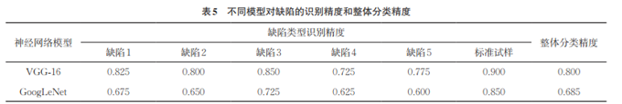 不同模型對缺陷的識別精度和整體分類精度如表5所示。由表5可知:VGG-16模型對5種不同類型缺陷的識別精度更高,整體分類精度達到了0.800;GoogLeNet模型的整體分類精度僅為0.685。表明VGG-16模型在工業(yè)不銹鋼焊管缺陷分類識別中的準確性和穩(wěn)定性明顯優(yōu)于GoogLeNet模型。