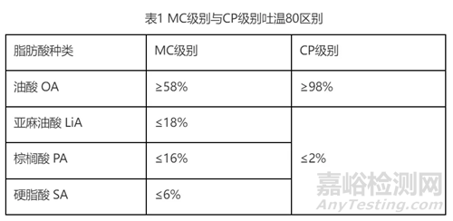 作為常用的藥物輔料,市售注射用吐溫80主要有MC(多藥典級)和CP(中國藥典級)兩種級別,其主要差異在油酸含量上,見表1。其中,CP級別常用供應(yīng)商日油和南京威爾,MC級別有JT、Sigma和禾大等。