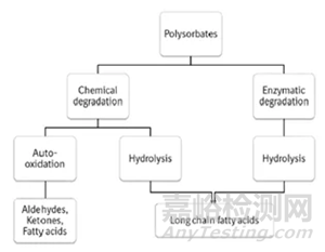 吐溫80可以通過氧化和水解途徑降解,見圖1,其中水解反應(yīng)是化學(xué)誘導(dǎo)的或酶催化的,氧化反應(yīng)一般由化學(xué)誘導(dǎo)。吐溫80作為生物制劑的一種保護(hù)劑輔料使用,但也可能影響蛋白質(zhì)制劑的質(zhì)量,從而對功效、安全性和穩(wěn)定性起到不利作用。目前,藥品監(jiān)管部門對吐溫80的控制要求越來越嚴(yán)格。