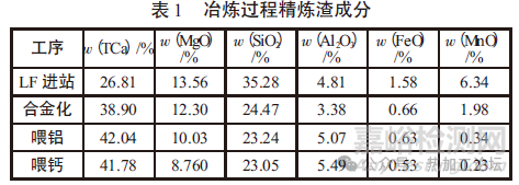 對精煉LF進站、合金化、喂鋁、喂鈣分別取精煉渣渣樣進行主要化學成分分析,結果如表1所示。
