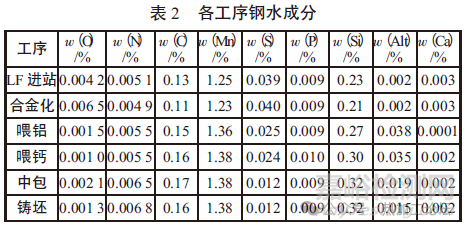 對LF進站、合金化、喂鋁、喂鈣、中包、鑄坯分別取鋼樣進行主要化學成分分析,各試樣化學成分如表2所示。