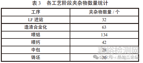利用電鏡和顯微鏡對LF各階段以及中包和鑄坯試樣進行掃描,每個試樣掃描10mm2范圍統(tǒng)計夾雜物數(shù)量,結果如表3所示。