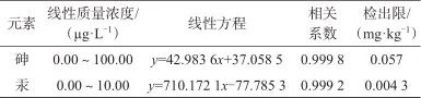 表1 砷、汞的線性范圍、線性方程、相關(guān)系數(shù)和檢出限