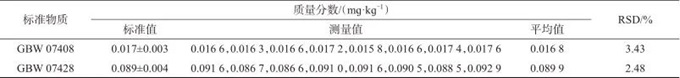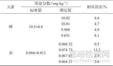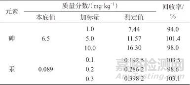 稱取有證標準物質(zhì)GBW 07408、GBW 07428平行樣品各8份,按1.5方法處理并測定,試驗結(jié)果見表2和表3。由表2可知,標準物質(zhì)GBW 07408、GBW 07428砷的測定平均值分別為12.48、6.52 mɡ/kɡ,標準值分別為12.7±1.1、6.5±1.3 mɡ/kɡ。由表3可知,標準物質(zhì)GBW 07408、GBW 07428汞的測定平均值分別為0.016 8、0.089 9 mɡ/kɡ,標準值分別為0.017±0.003、0.089±0.004 mɡ/kɡ。兩種標準物質(zhì)測定值均在標準值的不確定度范圍內(nèi),砷的相對標準偏差分別為2.79%、3.82%,汞的相對標準偏差分別為3.43%、2.48%,表明該方法精密度良好。