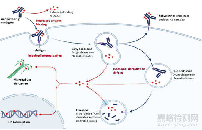 由于ADC的結構復雜,其作用機制由多個步驟組成,從抗原表達和識別開始,通過內化和降解到細胞毒藥物釋放和細胞凋亡調節(jié),可在任何水平發(fā)生耐藥。
