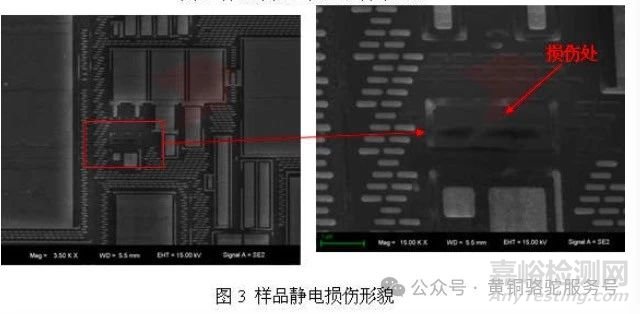 分析方法簡(jiǎn)述:電參數(shù)測(cè)試結(jié)果表明,樣品的3.3v video IF supply端口對(duì)地端之間表現(xiàn)為漏電特性。對(duì)樣品進(jìn)行開(kāi)封檢查,表面未發(fā)現(xiàn)異常形貌。在漏電端口和vss之間施加電壓,激光掃描顯微鏡下進(jìn)行失效定位,可見(jiàn)樣品芯片上存在異常亮點(diǎn),該點(diǎn)在激光加熱下,阻值發(fā)生變化,光發(fā)射顯微鏡的電源探測(cè)到該阻抗變化,并標(biāo)記顏色。對(duì)存在異常亮點(diǎn)的芯片進(jìn)行去層并用SEM放大觀察,發(fā)現(xiàn)樣品異常亮點(diǎn)附近存在靜電損傷形貌。