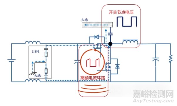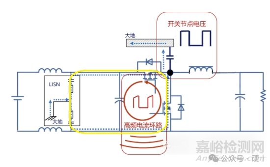 可以看到高頻電流環(huán)路存在于開關(guān)管和連接開關(guān)管的電容形成的回路,因為電流變化最劇烈的通常在開關(guān)管之間,電流是在兩個開關(guān)管之間切換,而通常電感由于電流不能突然變化,di/dt受到限制,而不是我們重點考察高頻電路環(huán)路的部分。
