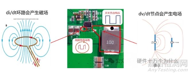 找到高頻電流環(huán)路后,我們需要抑制該噪聲源引起的近場磁場。最有效的方式就是減少該環(huán)路的面積,通常電流大小需要滿足功率輸出的要求,不能隨意減小。