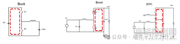 首先,我們需要找出不同拓撲的高頻電流環(huán)路。如圖所示,虛線的環(huán)路便是di/dt變化比較大的電流高頻環(huán)路,可以看到BUCK電路,電流高頻環(huán)路存在于輸入電容和兩個開關(guān)管(或者一個開關(guān)管和一個二極管)形成的閉合環(huán)路,而BOOST電路作為對偶拓撲,電流高頻環(huán)路存在于輸出電容和兩個開關(guān)管。而SEPIC電路的電流高頻環(huán)路存在于兩個開關(guān)管和兩個電容形成的環(huán)路中,如圖所示。