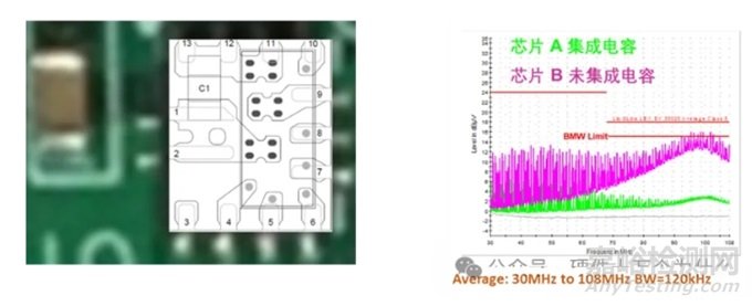 分別測試集成電容和未集成電容的兩顆芯片A和B,同樣的芯片和PCB布局,可以看到CISPR25傳導(dǎo)高頻部分,集成電容的芯片具有更低的高頻噪聲,具有較大的優(yōu)勢通過傳導(dǎo)測試。