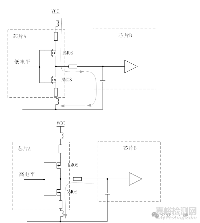 (2)芯片外部電源引腳提供給內(nèi)部晶體管一個公共的電源節(jié)點,當晶體管狀態(tài)轉(zhuǎn)換時必然引起電源噪聲在芯片內(nèi)部傳遞。
