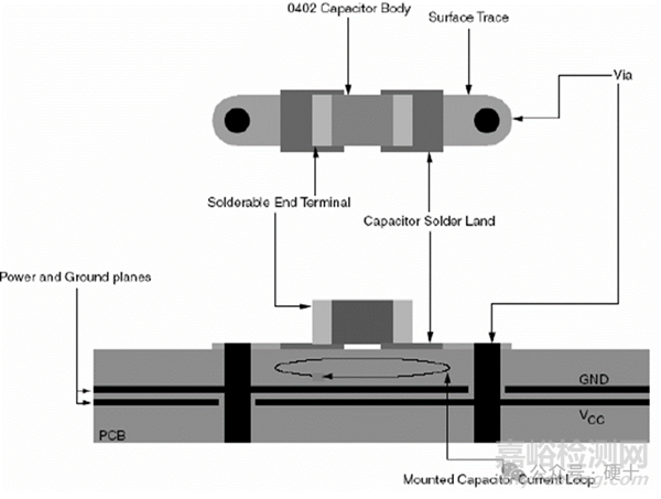 •第二種方法在焊盤二端打過孔,比第一種方法路面積小的多,寄生電感也較小,可以接受。