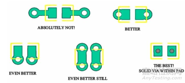放置過孔的基本原則就是讓這一環(huán)路面積最小,減小寄生電感。下圖顯示幾種安裝方法。