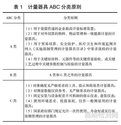 (2)圍繞“保證重點、兼顧一般、區(qū)別管理、全面覆蓋”的原則,根據(jù)計量器具的功能用途和現(xiàn)場使用情況及環(huán)境,企業(yè)所有計量器具的管理可按表1所示分為A、B、C 3類進行管理。
