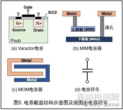 芯片中常見的電容主要分為varactor電容、MIM電容和MOM電容三種,如圖5所示,三種電容的結(jié)構(gòu)不同,電容值和應(yīng)用場合也有所區(qū)別。
