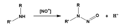 反應(yīng)性亞硝化劑有多種潛在來源,可作為亞硝胺前體(表4)。 腫胺的亞硝化通常被描述為胺與亞硝酸陽離子(NO+)或三氧化二氮(N2O3)的反應(yīng),兩者都可以與亞硝酸平衡存在。 胺的亞硝化依賴于pH,在酸性條件下(pH 3-4)通常更快。 酸性溶液中最常見的反應(yīng)途徑是通過亞硝酸和仲胺。然而,也描述了自由基途徑與NO/O2和原位生成硝基鹽的反應(yīng)。 此外還報告了醛催化亞硝化的情況。在機理上提出醛類催化劑與二羥基胺發(fā)生反應(yīng),形成亞胺類。 亞硝酸鹽添加到亞胺中間體形成亞硝酰供體,亞硝酰供體可與另一當(dāng)量仲次胺反應(yīng)形成亞硝胺并生成醛催化劑。 這種途徑即使在中性或堿性介質(zhì)中也可以允許亞硝化。