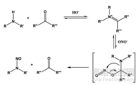 路線2:仲胺在堿性條件下的被羰基化合物催化的亞硝化