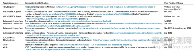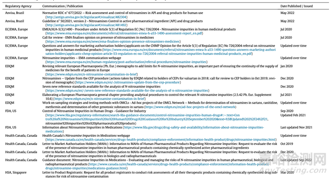 監(jiān)管機構(gòu)就亞硝胺提交的主要指引文件
