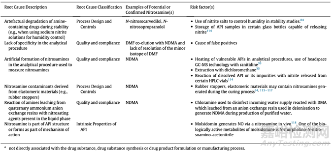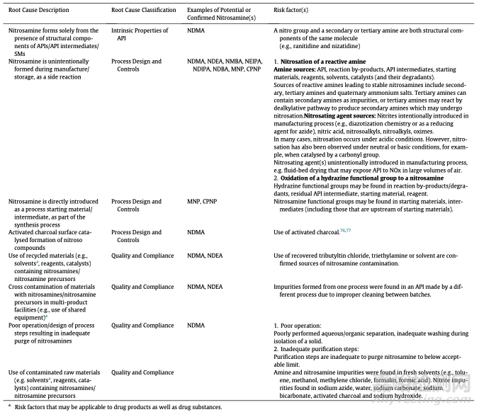 表2:亞硝胺形成和活性藥物成分(API)污染的根本原因和風(fēng)險因素示例