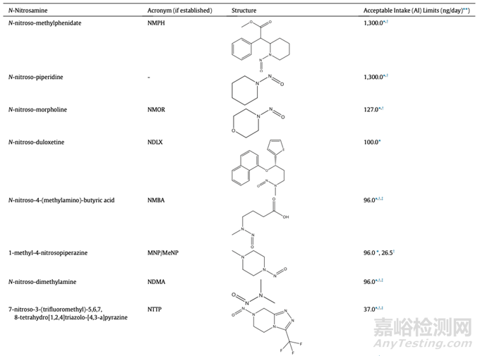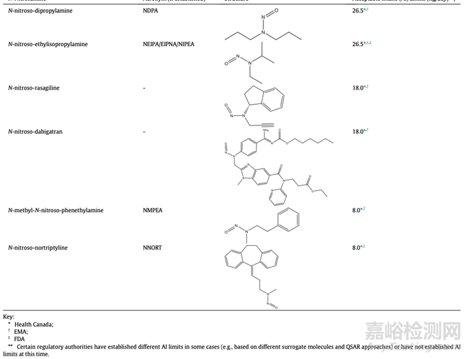 表7:個別監(jiān)管機構(gòu)公布的藥物產(chǎn)品中亞硝胺雜質(zhì)的可接受攝入量限制的例子(不一定適用于所有國家和地區(qū))