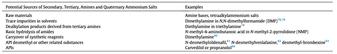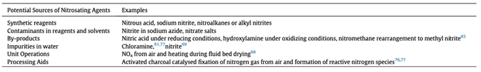 表2概述了原料藥中亞硝胺形成和污染的根本原因和危險因素。表3和表4分別列出了胺和硝酸鹽源用亞硝胺前體。