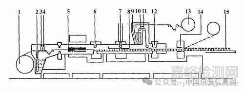 1—材料卷筒;2、9—過氧化氫槽;3—吸氣吸液工;4、11—干燥空氣;5—加熱元件;6—熱朔材料成型(用無菌空氣);7—無菌充填部位;8—充填區(qū)域(無菌通道);10—負(fù)壓干燥;12—真空封口;13—鋁材料卷筒(上蓋);14—沖剪模;15—輸出。
