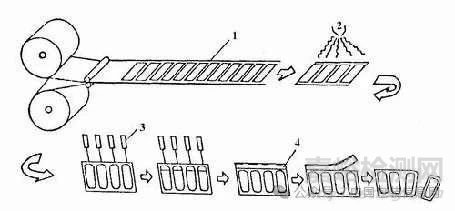 圖3所示為塑料袋無菌包裝系統(tǒng)。在該系統(tǒng)中兩個卷筒塑料薄膜上下合在一起,然后封成各自獨立的小袋子。根據(jù)塑料材料的種類,可對這些包裝袋采用不同的方式滅菌。已經(jīng)過滅菌的產(chǎn)品用無菌針注進(jìn)這些預(yù)先殺菌的包裝袋內(nèi),滿袋灌裝后,在灌裝點以下封口,完成無菌包裝,輸出無菌包裝件。