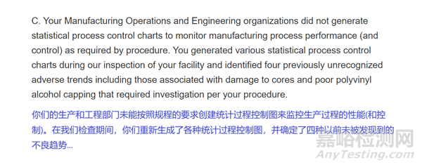 這是有意設(shè)計的嗎?當(dāng)然,這就是他的本意。FDA 引用 CFR 210/211 第 21 條,批評該公司缺乏表明工藝持續(xù)“受控”的活動。即生產(chǎn)和工程部門,尚未創(chuàng)建控制圖來監(jiān)視和控制生產(chǎn)過程。這正是公司在其內(nèi)部程序中所規(guī)定的。在檢查過程中該公司對此采取了糾正措施(即重新制作了控制圖),結(jié)果發(fā)現(xiàn)了四個以前未被發(fā)現(xiàn)的不良趨勢。因此,SPC 的有用性在檢查過程中直接得到了證明。