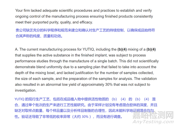 FDA 工藝驗證指南更新的創(chuàng)新之一是引入了一種更科學(xué)的工藝驗證方法。這也清楚地反映在這封警告信中。FDA 批評了不科學(xué)的驗證方法。FDA批評其混合均勻性在采樣位置和采樣(采樣點數(shù)量、樣品量、樣品制備)方面存在缺陷。