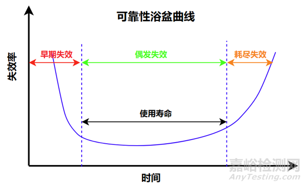 因此出現(xiàn)功能故障或超出預(yù)期的性能退化都可以認(rèn)為是出現(xiàn)了可靠性問題。為了理解不同時(shí)期器件失效發(fā)生的物理機(jī)理,可靠性工程中引入著名的“浴盆曲線”概念。