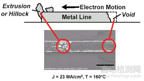 EM是指在通電導(dǎo)體中,由于電流和溫度的作用,電子的移動與金屬離子產(chǎn)生碰撞,導(dǎo)致金屬離子移位的現(xiàn)象。金屬原子沿電子流方向遷移時(shí),會在原有位置上形成空洞,同時(shí)在連接處容易形成金屬原子堆積出現(xiàn)丘狀突起,前者容易導(dǎo)致斷路,后者容易引起相鄰金屬線間的短路。