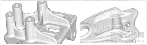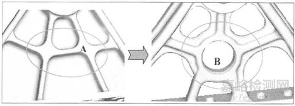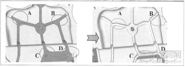 A區(qū)為傳統(tǒng)的十字型筋,筋的交接處形成熱節(jié),將導致嚴重的縮孔、縮松;B區(qū)以工藝孔的形式避免筋的直接相交,在保證零件強度的同時有限減小熱節(jié),確保了零件內(nèi)在質(zhì)量臺格。