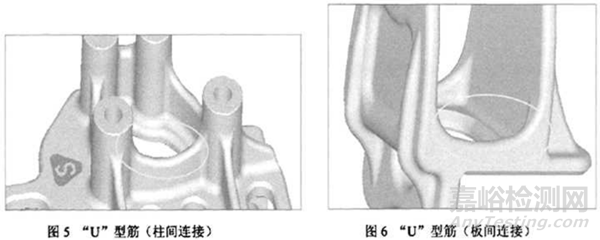 “U”型筋外形近似“U”型,通常由三段圓弧構(gòu)成,中間圓弧為大圓弧(直徑一般為兩端的3倍以上),為“矩形筋”的演變升級,通常用于兩柱或兩板間連接。如圖5,為某乘用車壓縮機支架,用于兩圓柱間連接;如圖6,為某商用車翻轉(zhuǎn)支架.用于兩板間連接。